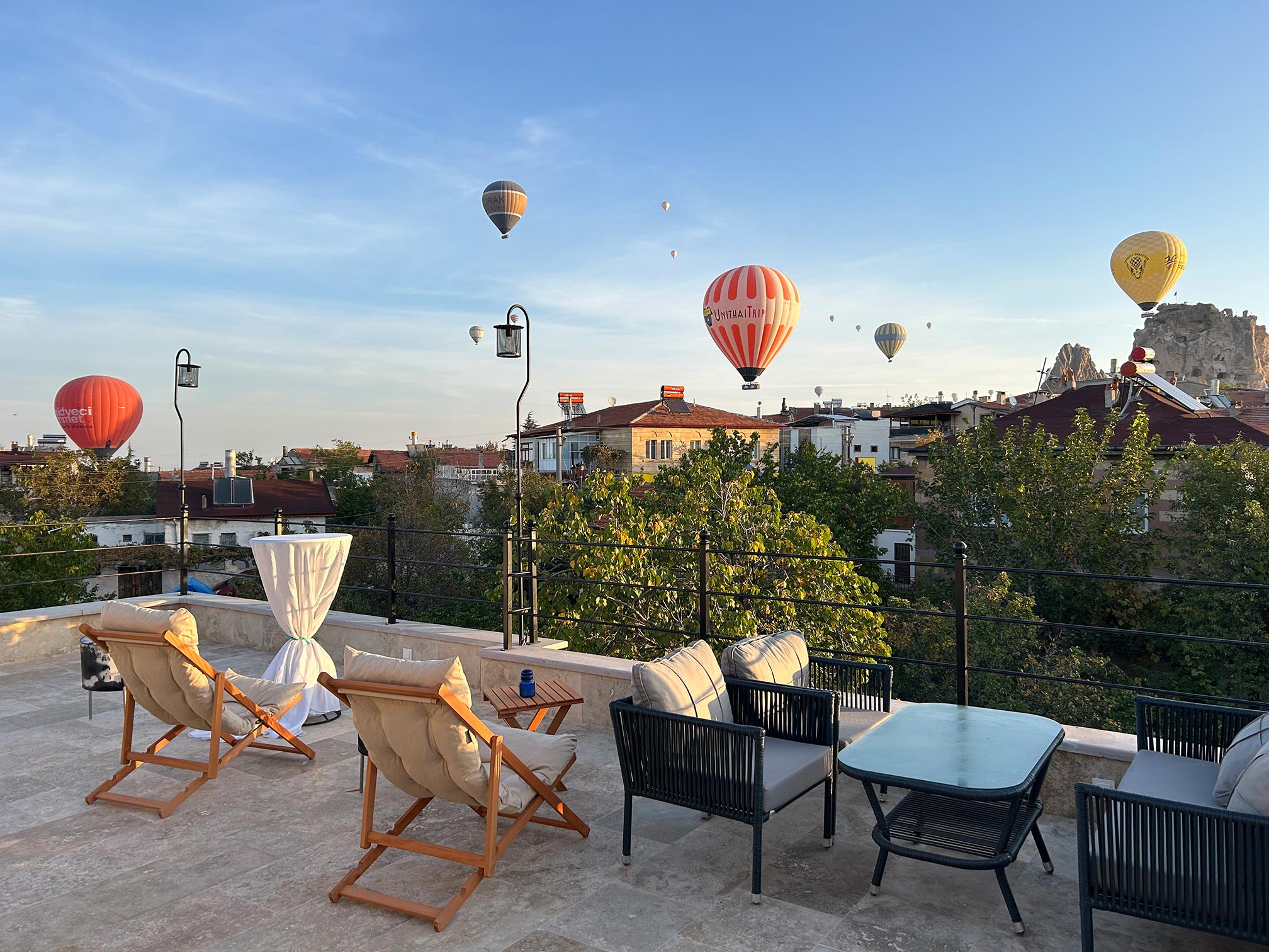 Guests can relax in our peaceful garden and spacious terraces after a day of exploration. In the early morning, the terraces offer unforgettable views of hot air balloons drifting across the sky, one of Cappadocia’s most magical sights.